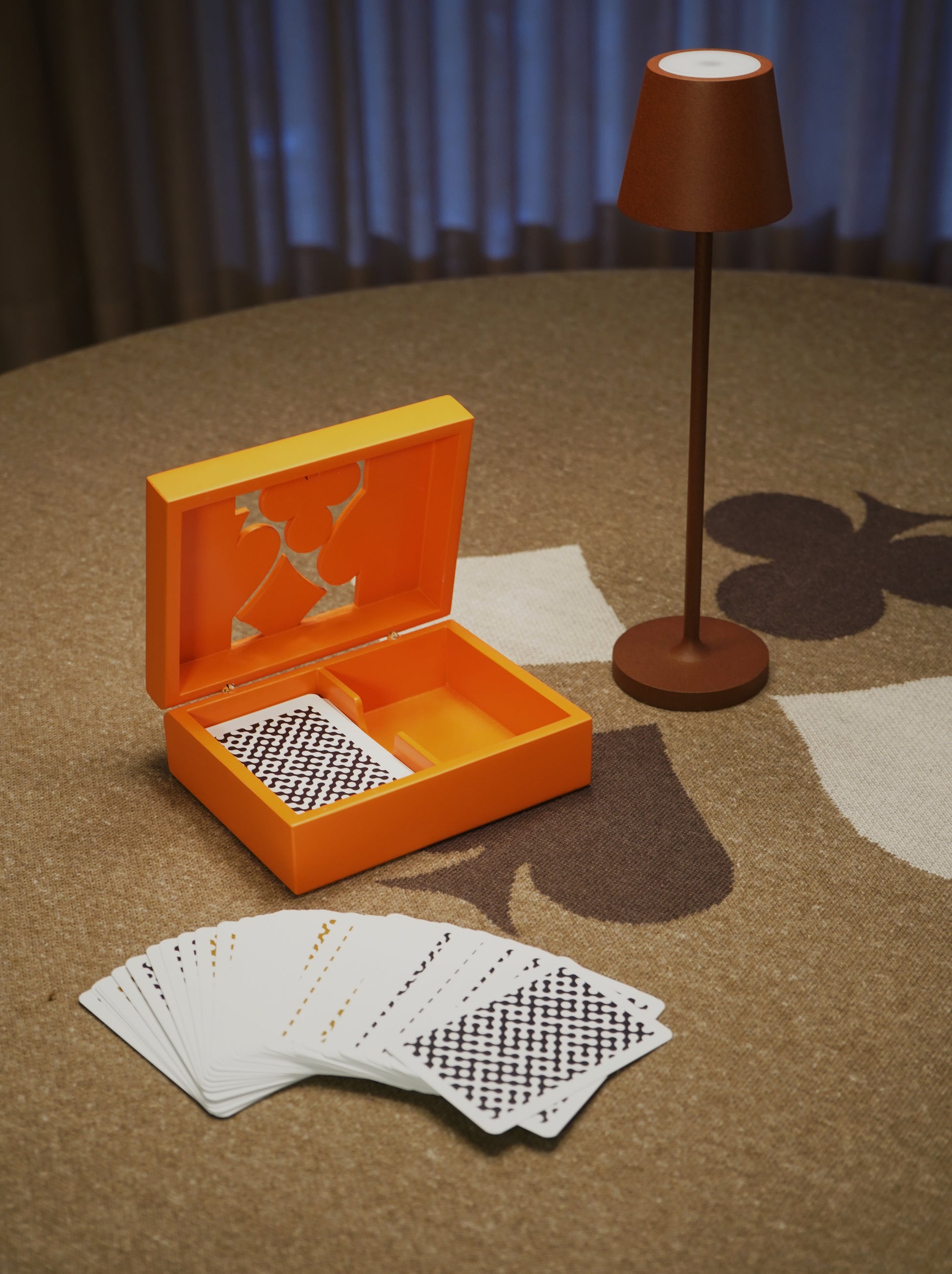 O Porta Baralho Naipes – Laranja é a escolha ideal para quem valoriza organização com estilo. Feito em madeira resistente, ele acomoda seus baralhos com praticidade e um toque de elegância à mesa de jogos.