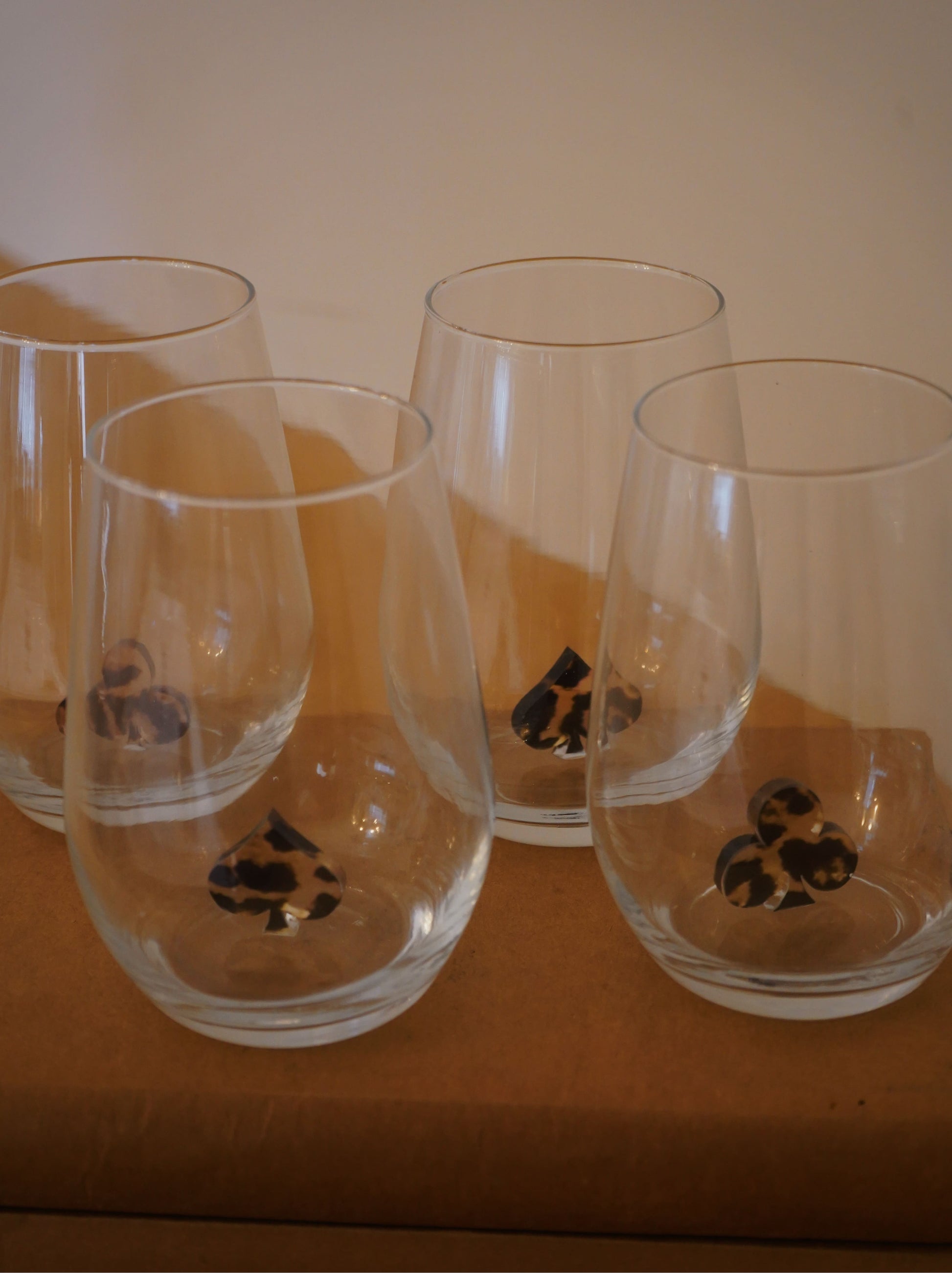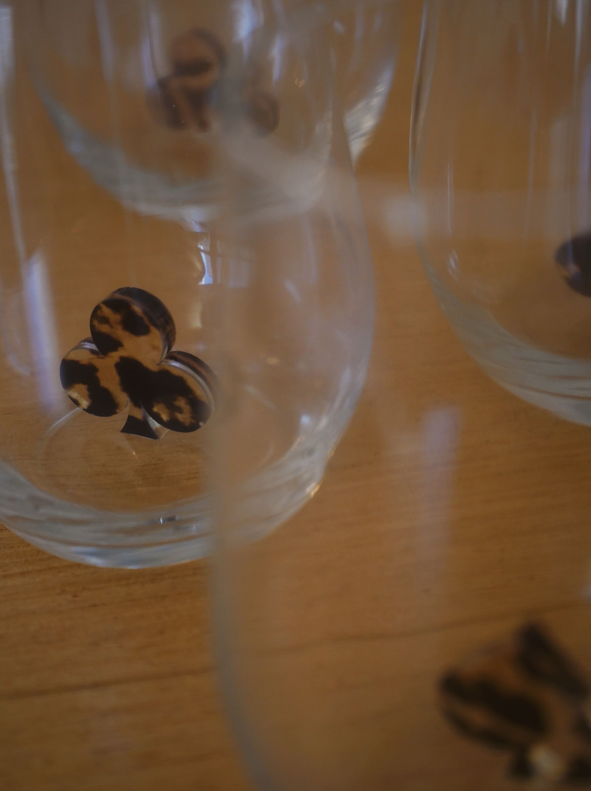 O kit vem com 4 copos de vidro, cada um com pingentes decorativos em acrílico no fundo, representando os naipes de espadas e paus, em estampa onça. Um toque criativo que transforma o simples ato de servir bebidas em uma experiência especial.
