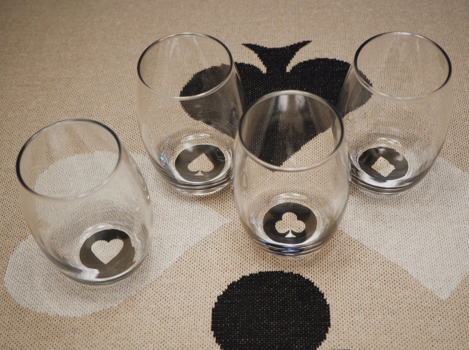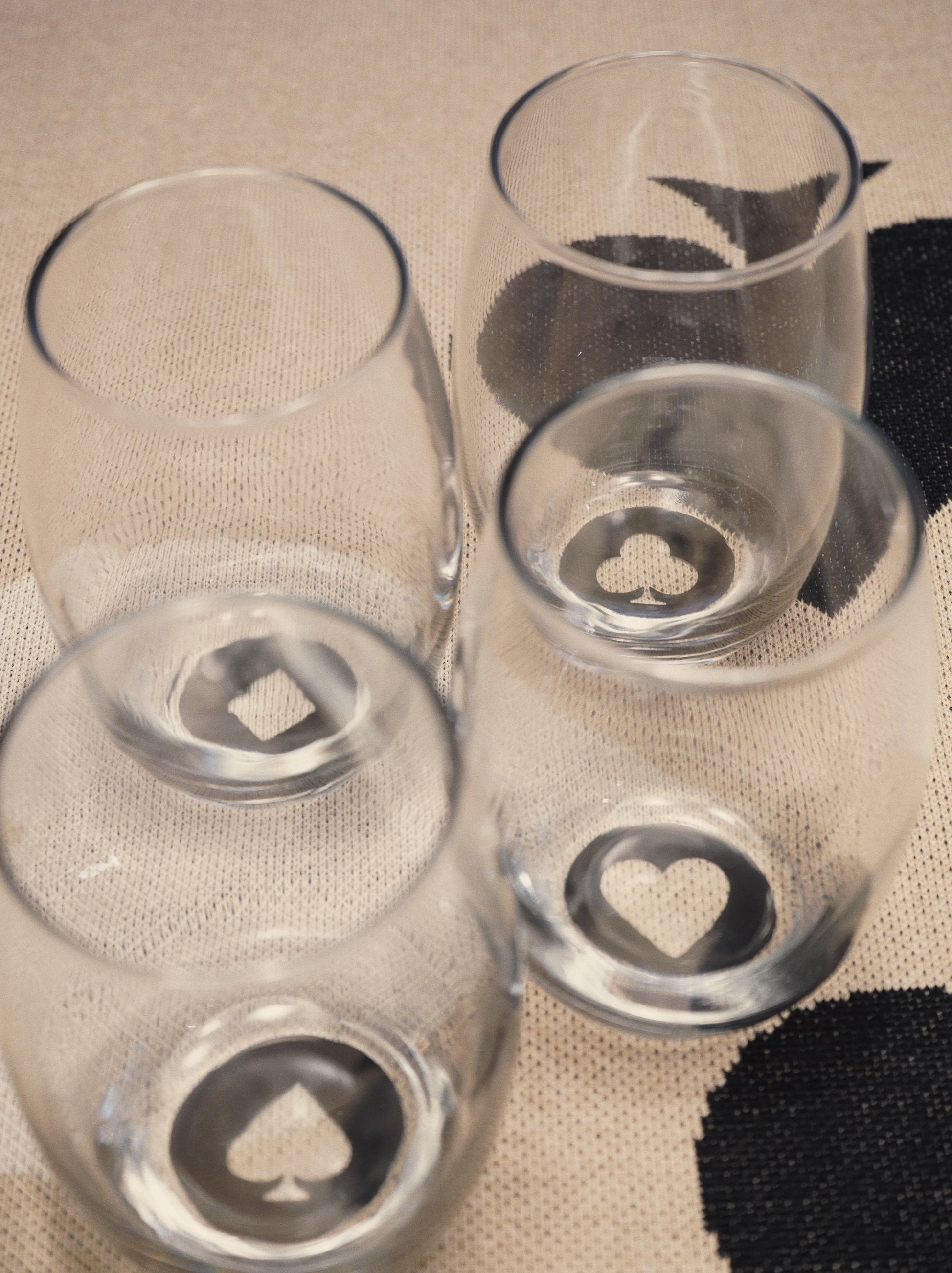 O jogo de copos de vidro Naipes é o toque final para uma mesa de jogos completa. Com design elegante e silk de naipes no fundo de cada copo, ele transforma cada gole em parte da experiência.