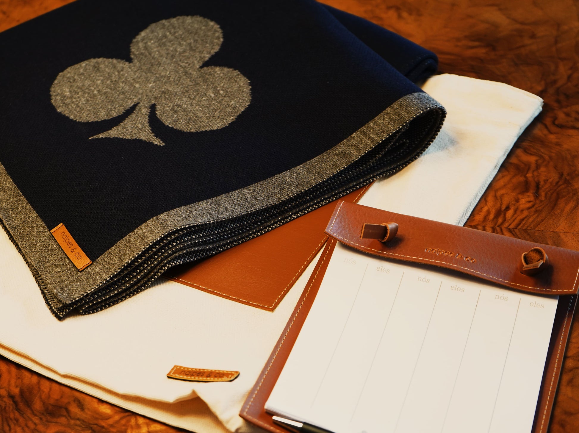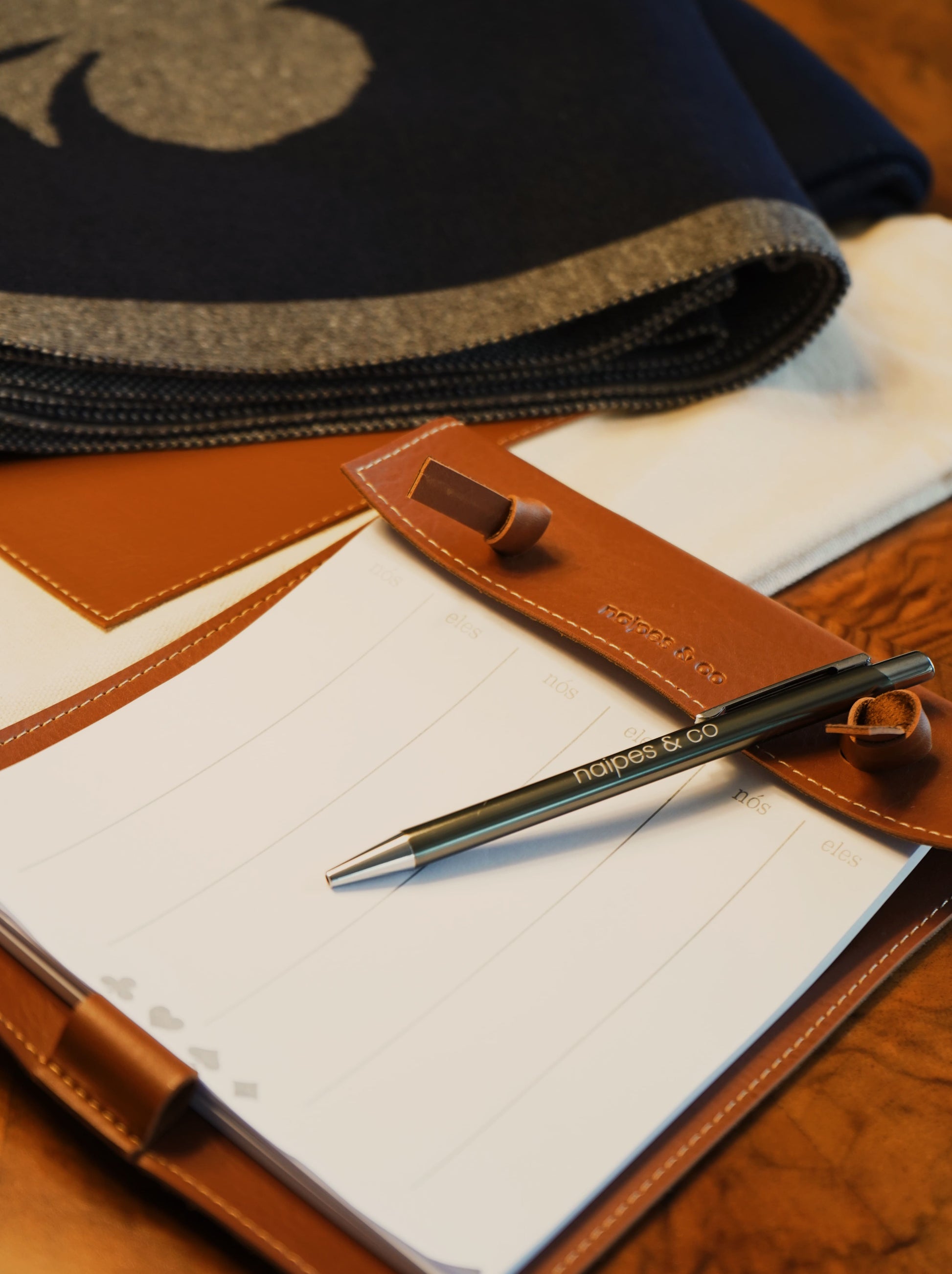 A toalha Gift em navy com mescla é puro estilo e praticidade, enquanto o porta-bloco com caneta acompanha os lances com categoria. Vai embalado para surpreender desde o primeiro olhar.