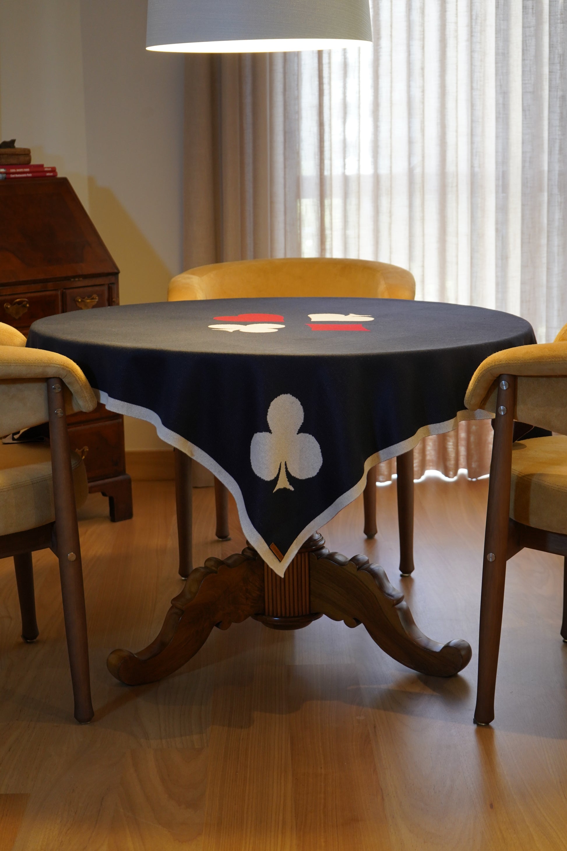 Cor: Marinho com naipes em vermelho e off-white e faixa na borda off-white
