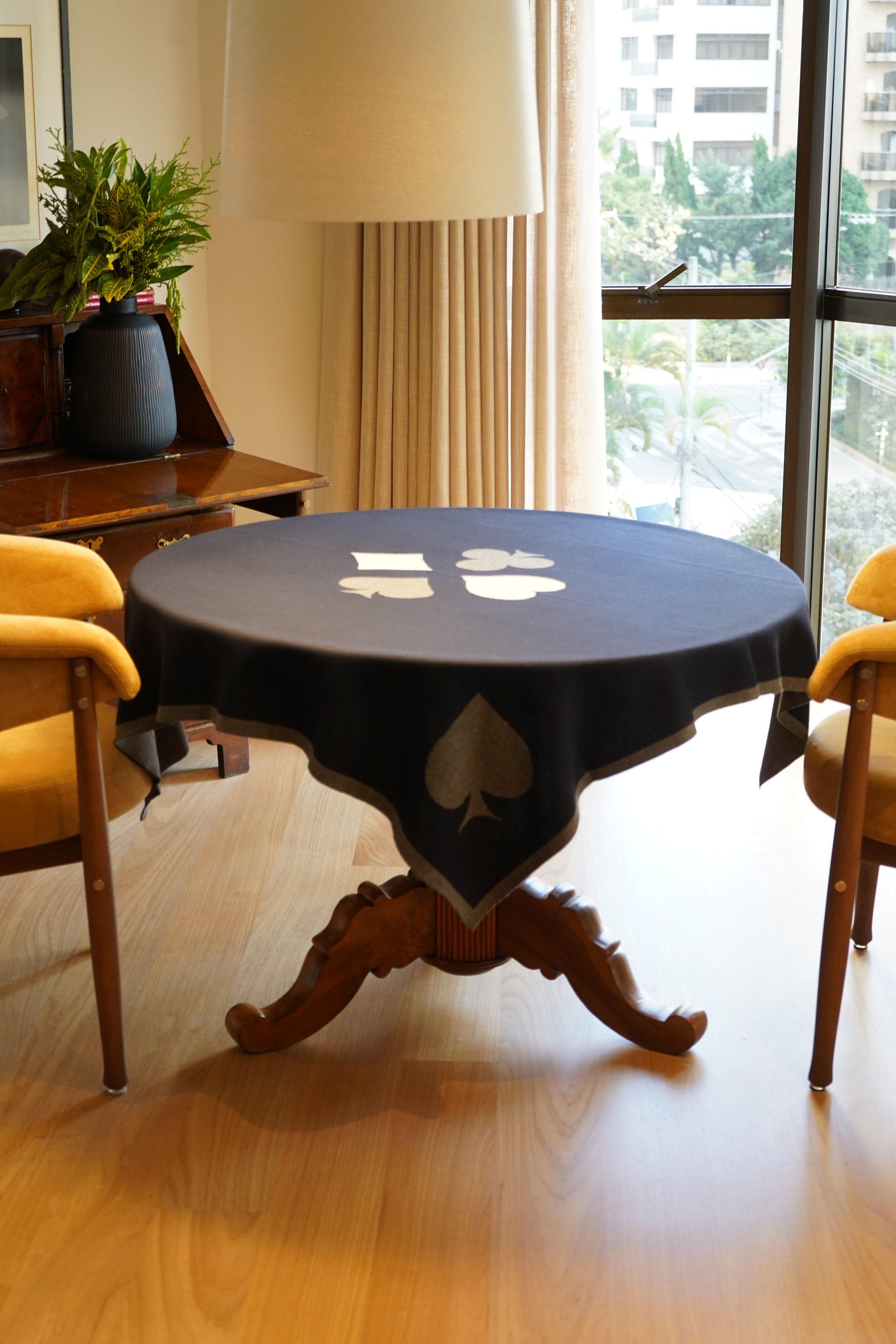 Com desenhos de naipes no centro e nas pontas, sua paleta em marinho com mescla e detalhes off-white cria um visual elegante e acolhedor, ideal para quem valoriza os detalhes.