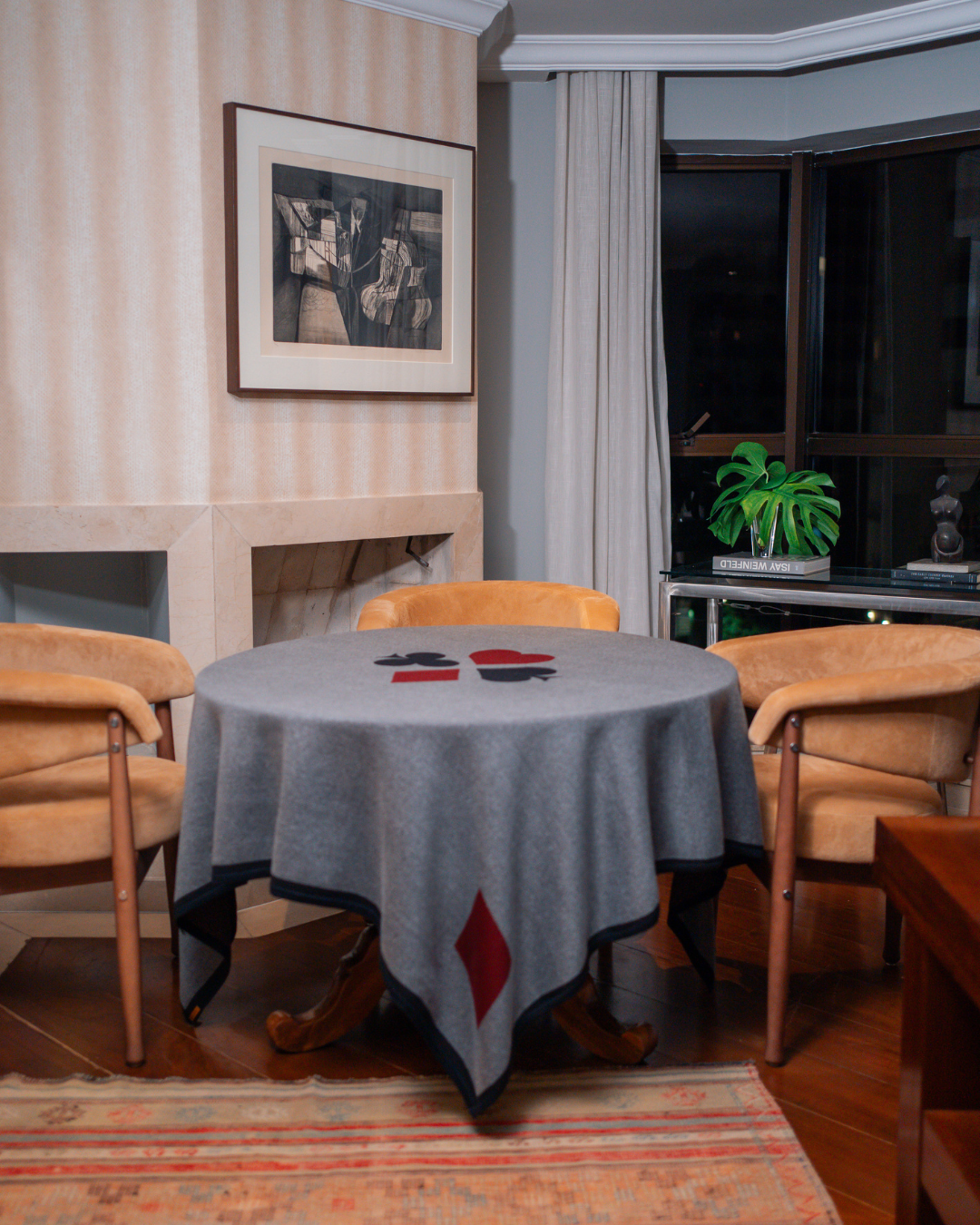 A Toalha de Jogos Trust é um convite à tradição. Com desenhos de naipes em preto e bege no centro e nas pontas, ela une a sobriedade dos clássicos à elegância discreta dos detalhes bem pensados.